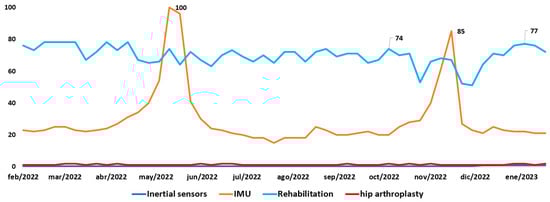 Additionally, Google Trends [4] examines the level of interest in searches for specific keywords over a given period. By analyzing samples of these searches, we can measure the level of interest in various topics, such as inertial sensors, IMUs, rehabilitation, and hip arthroplasty, across all Google searches performed over the past five years and compare the popularity of these searches.