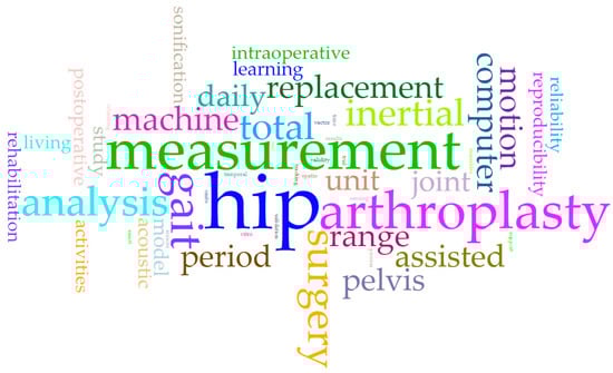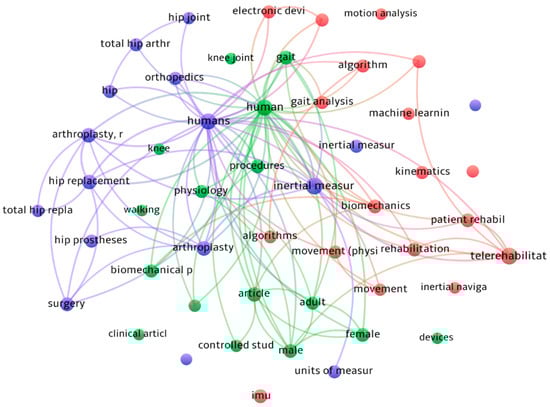 Figure 2 shows a bibliometric review considered in this study with VOSviewer [7], a computer program used for bibliometric analysis. This review focused on identifying and analyzing the terms related to the technologies used and inertial sensors for measuring and monitoring the implant provided in arthroplasty treatments. The resulting graph shows the co-occurrence of these terms in the scientific literature, with larger nodes indicating more frequently occurring times and stronger relationships between the words.
