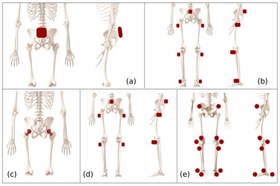The study [12] uses a system similar to that of Figure 3b; the system is based on determining the moment of contact with the ground and the inclination of the knee. This system measures the gait time and thus generates sounds that will be fed back to the patient who tries to align his movements to the proposed sound, according to the footsteps and the typical gait pattern to which he should be moving. The optical tracking system proposed in [13] uses markers in the positions specified in Figure 3e, and using vision systems allows one to identify the places reached by the hip and limbs of the person in his rehabilitation process.