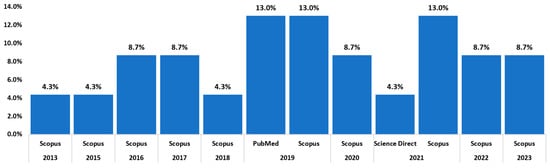 Figure 6 shows the number of studies found in the databases; 13% corresponds to the PubMed database with three studies, 82.6% in the Scopus-indexed database with two articles, and 4.4% in the Science Direct database with one article. The most significant research in this literature review is focused on journals. The most significant number of scientific papers are in PubMed.