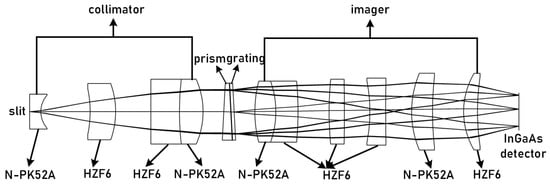 - Chen, J.; Yang, J.; Liu, J.; Liu, J.; Sun, C.; Li, X.; Cui, J. Optical design of a short-wave infrared prism-grating imaging spectrometer. Appl. Opt. 2018, 57, F8–F14. [Google Scholar] [CrossRef] [PubMed]