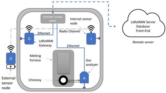 A scheme of the developed system composed of internal nodes I, the gas analyzer A, and the LoRaWAN gateway (inside the building where the furnace is hosted). Outside the building, there are the external nodes, O, that differently from the other system is battery powered.