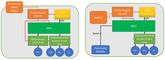 The internal and external sensor nodes have approximately the same structure. They are based on a microcontroller that acquires environmental data through a specific ad hoc designed electronic front end for each type of sensor (electrochemical, NDIR [19], particulate digital sensor).