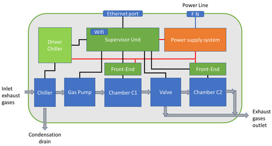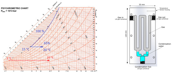 The gas analyzer, as shown in Figure 3, contains a gas sampling system to pump and dehumidify exhaust gases (exploiting the block called chiller) before they are introduced into the two measurement chambers. The chiller is based on an ad hoc designed thermoelectric module, inserted in a control loop that cools the gas entering the analyzer. This gas conditioning system is mandatory when working with high-temperature gases containing water, such as combustion exhausts, to avoid water condensation inside the instrument. In fact, exhaust gases at high temperatures are easily saturated by water vapor and can produce condensation when, while flowing through the measuring chambers, cool down. The thermoelectric cooler was designed and tested to cool the gases from a temperature around 100 °C and a humidity level close to 100% RH to a temperature lower than 15 °C, exploiting a temperature measurement and a feedback loop for controlling the power delivered to the Peltier cell, thus obtaining, when gases return to environmental temperature, relative humidity around 65% RH that avoid the risk of condensation inside the instrument (as shown in the psychometric chart in Figure 5). The chiller is based on a metal structure (shown in the leftmost drawing of Figure 5) that is cooled by two Peltier cells. At the bottom of this structure, a pump drains the condensed water generated by the gases.