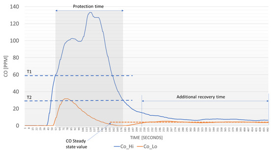From the test reported in Figure 4, it is evident the benefit of the protection mechanism: the presence of a CO_Hi sensor allows for avoiding long recovery time for CO_Lo, which is the sensor used for actual monitoring. In detail, the system behavior shown in Figure 4, highlights that if the CO_Hi sensor output overcomes the threshold T1, the system deviates the gas flow from the CO_Lo sensor that can recover quickly the zero. When the CO_Hi detects a concentration lower than the threshold T2 the sensor CO_Lo is exposed again to the gas (low concentration) allowing a fast-settling time different from the CO_Hi sensor that, due to the exposition to a very high CO concentration, requires a longer recovery time. Obviously, this technique generates benefits only in the presence of fast high-concentration transients (such as the CO typical behavior in a burner) and when the concentrations of interest are below the threshold T2 set for valve intervention, which is decided according to the measurement range.