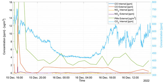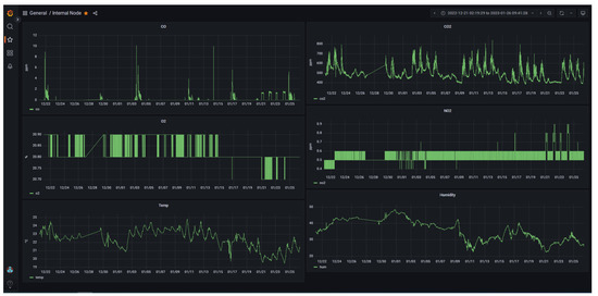 The data transmitted by the sensor nodes through the LoRa channel are collected by the gateway and transmitted to the remote LoRaWAN server. The data collected by the analyzer are directly sent to the server through the local network. Data are then stored in a database on the server and are accessible with a front end based on Grafana v 9.1.4, an open-source dashboard platform, as shown in Figure 7, which presents the data gathered by the internal node, CO, NO2, CO2, O2 concentrations, temperature, and relative humidity over a period of about 18 days.