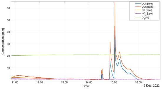 Figure 8 and Figure 9 report some examples of the outputs obtained by the complete distributed measurement system. Data are shown in two different plots: Figure 8 displays the gas concentration measured by the gas analyzer during furnace operations whereas Figure 9 shows the target gas concentrations measured by both the internal sensor node (one sample per minute) and the external node (one sample per hour) during the following day.