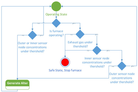 Once these pre-processing calculations have been applied, the gas analyzer data can be used for two main purposes. One is to monitor that fusion processes are running correctly and do not deviate from the expected behavior. The second is to promptly detect dangerous high emissions of toxic compounds whose leakage can poison the air inside the plant and expose worker to risk. In Figure 10, the state machine implementing the decision algorithm is illustrated. The operating state is the normal operation of the plant when no anomalies are detected. In case of anomalies generated by the melting furnace, detected by the analyzer of the exhaust gases or by the internal sensor node, a safe state is triggered, and the furnaces can be stopped.