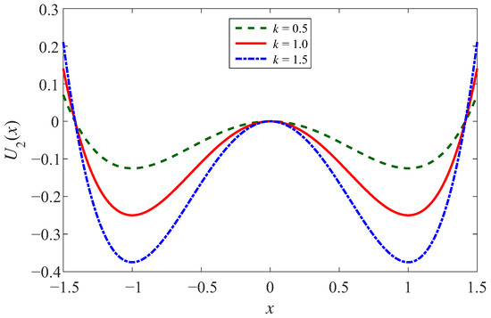Under the circumstance of the controlled well width, let , and . Then, analyzing the potential function Equation (3), the potential barrier of Equation (3) exists at x = 0, which is similar to the controlled well depth. The difference is that the potential wells are at , where the depth of potential well is and the width of the potential well is . It is uncomplicated to note that the depth of the potential well is only related to and , and k controls the width of the potential well. Consistent with the above, we assume that , Figure 3 shows the effect of different k on the potential well width, where k is taken respectively as 0.5, 1, and 1.5. With the increase of k, the depth of both potential wells remains constant, the width of the potential well increases, and the bottom of the potential well becomes smoother [42,43,44,45].
