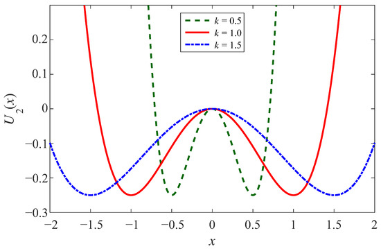 Further, CSSR is defined as the controlled potential well depth and the controlled potential well width. In the case of the controlled well depth, let A = B = k. Then, through analyzing the potential function Equation (3), two minima, the potential wells, are located at . The potential barrier is located at x = 0, with a height of . So the parameter k is independent of the positions of the potential wells and the potential barrier, which are only related to and . For the ease of analysis, we assume that , Figure 2 shows the effect of different k on the potential well depth, where k is taken as 0.5, 1, and 1.5, respectively. It is not tough to find that the depth of the two potential wells gradually increases and the walls of the potential wells gradually steepen as k increases [39,40,41].
