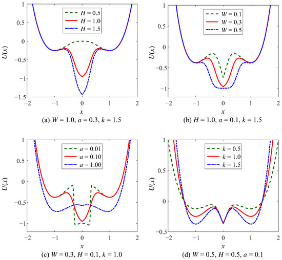 The parameters (H, W, a) of the WSSR control the intermediate potential well of the CSwWSSR, which have the same impact on the potential function as for the WSSR, as shown in Figure 4 and Figure 5. In the case of the controlled potential well depth, the depth of the intermediate potential well gradually increases with increasing H, the width of the well gradually increases with increasing W, and the steepness of the potential well wall gradually becomes slower with increasing a in Figure 4a–c. The potential wells on the left and right sides depend on parameter k of the CSSR, which can be simply realized that the well depth increases with the increase of k in Figure 4d.