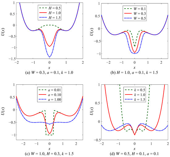 Since the potential function of CSwWSSR is generated in the combination of WSSR and CSSR where CSSR has two cases, i.e., the controlled potential well depth and the controlled potential well width, CSwWSSR should also be discussed in two cases. On the basis of the aforementioned analysis of CSSR, we find that and do not affect the potential function either in the controlled well depth or the controlled well width, so we assume that . Accordingly, the total four parameters controlling CSwWSSR are (H, W, a, k) in any case.