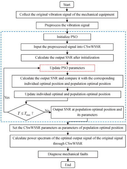 In light of the analysis of the CSwWSSR in Section 2.1, We draw the conclusion that the CSwWSSR depends on four parameters (H, W, a, k). In order to optimize the output, the particle swarm optimization (PSO) [46,47,48] is used to make the best match between the system parameters and the input signal. Figure 6 provides an illustration of the CSwWSSR model for weak fault detection using PSO. Here, the objective function of the PSO is output SNR from [35], which is defined as follows
