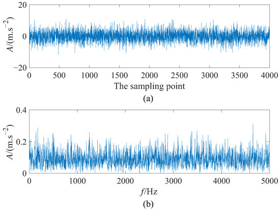 where is additive Gaussian white noise with where noise intensity D = 5 and represent statistical average operator. A denotes the amplitude of the simulation signal with A = 0.25. To be specific, the fault characteristic frequency = 140 Hz, the sampling frequency = 10,000 Hz, and the data length N = 4000. To satisfy the requirement of adiabatic approximation theory to achieve small parameters of SR, the scale compression ratio ∂ = 2000, then the step size . Figure 7 displays the simulation signal’s time domain waveform and power spectrum. It is obvious that the input signal without SR processing is completely drowned in the surrounding noise at the fault characteristic frequency = 140 Hz in the frequency domain diagram, so detecting the fault of simulation signal is challenging. Moreover, the waveform of the signal is not visible in Figure 7a.