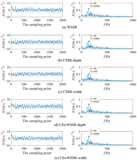 From Table 1, in view of the output SNR of the above simulation signal, it is seen clearly that the output SNR is: −9.777 dB (CSwWSSR-width) > −9.863 dB (CSwWSSR-depth) > −10.16 dB (WSSR) > −10.85 dB (CSSR-depth) > −11.63 dB (CSSR-width). In Figure 8a, the amplitude of the output signal after WSSR processing at the fault characteristic frequency of 140 Hz is 0.5795. From Figure 8b,c, the amplitude of the output signal after CSSR processing at the fault characteristic frequency is 0.5406 and 0.49. It can be viewed that the amplitude of the output signal at the fault characteristic frequency after CSwWSSR processing is 0.6327 and 0.6292 in Figure 8d,e. The amplitude of fault characteristic frequency is 0.6327 (CSwWSSR-depth) > 0.6292 (CSwWSSR-width) > 0.5795 (WSSR) > 0.5406 (CSSR-depth) > 0.49 (CSSR-width). So the fault characteristic extraction capability is CSwWSSR > WSSR > CSSR. Furthermore, Figure 8b,c show that the fault characteristic frequency is more significantly influenced by the neighboring frequencies, which is evident from the fact that the amplitude of the non-fault characteristic frequency is nearly similar to the fault characteristic frequency after CSSR processing. Based on the analysis hereinbefore, the method of using the CSwWSSR model to implement weak fault detection for simulation signal appeared more suitable.