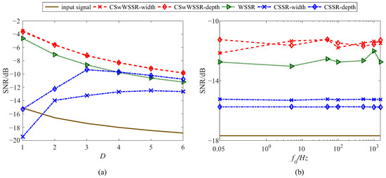 To evaluate the capability of the proposed CSwWSSR model in detecting different fault signals, it is demonstrated by a series of simulation signals with different fault characteristic frequencies and noise intensities. Consistent with the above, Equation (7) is used as the input signal by simply changing its fault characteristic frequency and noise intensity D, in which the fault characteristic frequency is from 0.05 to 1500 Hz and the noise intensity D is from 1 to 6. In Figure 9a, let the sampling points N = 4000, the signal amplitude A = 0.25, the sampling frequency = 10,000 Hz, the fault characteristic frequency = 140 Hz, and the rescaling ratio ∂ = 1000. In Figure 9b, let the sampling points N = 4000, the signal amplitude A = 0.2, the noise intensity D = 2, and the sampling frequency = . To meet the adiabatic approximation theory, the rescaling ratio ∂ = . As before, PSO was used to find the best parameter match with a population size and iteration number of 50 and 10, respectively. The average of the five final output SNRs was taken as the output SNR of the current signal. Figure 9 shows the variation of SNR with D and under three different models.
