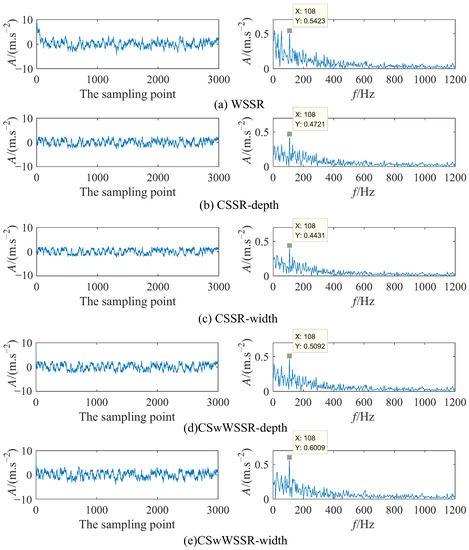 Figure 11 illustrates the time domain and frequency domain diagrams of the output signals for the five cases at the best match. 108 Hz is not hard to obtain from Figure 11, which is close to the fault characteristic frequency 107.30 Hz. In Figure 11a, the amplitude of the output signal after WSSR processing at the fault characteristic frequency of 108 Hz is 0.5423. From Figure 11b,c, the amplitude of the output signal after CSSR processing at the fault characteristic frequency is 0.4721 and 0.4431. It can be viewed that the amplitude of the output signal at the fault characteristic frequency after CSwWSSR processing is 0.5092 and 0.6009 in Figure 11d,e. The relationship between the amplitude at fault characteristic frequency in the five cases is clear: 0.6009 (CSwWSSR-width) > 0.5421 (WSSR) > 0.5092 (CSwWSSR-depth) > 0.4721 (CSSR-depth) > 0.4431 (CSSR-width). Although the fault characteristic frequency amplitude of WSSR is higher than this of CSwWSSR-depth, it is influenced by the low frequency, whose amplitude is almost equal to that of the fault characteristic frequency in Figure 11a. Taking into account, the fault characteristic extraction capability: CSwWSSR > CSSR > WSSR. Unlike the result in Section 3.1, CSSR outperforms WSSR in practical engineering applications. Consistently, CSwWSSR exhibits the excellent capability of weak fault detection. On account of the above analysis. CSwWSSR is also preferable to CSSR and WSSR in terms of effectiveness in practical engineering applications.