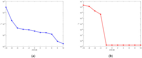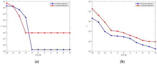 As shown in Figure 11a, in environments where SNR is greater than 0 dB, the estimation performance of the proposed algorithm for center frequency has significantly improved compared to the compared algorithm, with the estimated mean-square error reduced from the magnitude order of 10−7 to the magnitude order of 10−9. This is because the data length before compression for each segment of the FH signal in compared algorithm is 1024 points, while the data length before compression for each segment of the FH signal in the proposed algorithm is 2500 points. The larger the data length, the larger the frequency search range, and the higher the estimation accuracy of center frequency.
