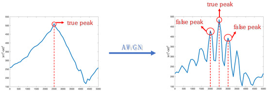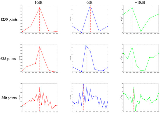 As shown in Figure 3a, the estimation accuracy of hopping time decreases as SNR decreases, because AWGN can affect the matching condition of all points in the observation object. Specifically, AWGN can introduce false peaks, and these false peaks interfere with the selection of the true peak, which is as shown in Figure 4. Moreover, as SNR decreases, the false peaks gradually approach and exceed the true peak, causing the false peaks to displace the true peak when selecting the peak.