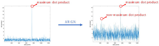 As shown in Figure 3b, when SNR is less than −2 dB, the estimation accuracy of center frequency decreases as SNR decreases. This is because AWGN can affect the selection of the maximum dot product. Specifically, AWGN can increase the amplitude of the non-maximum dot product, which is as shown in Figure 5. Moreover, as SNR decreases, the amplitude of the non-maximum dot product gradually approaches and exceeds the amplitude of the maximum dot product, causing the non-maximum dot product to displace the maximum dot product when selecting the dot product.