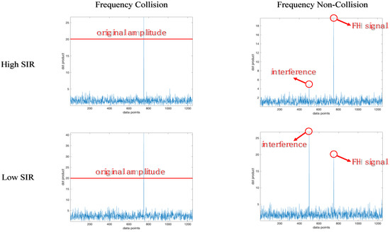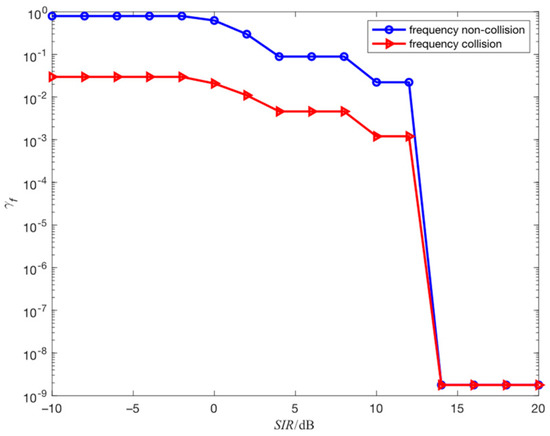 As shown in Figure 6, when the signal-to-interference ratio (SIR) is greater than 14 dB, the center frequency estimation accuracy is the same in both cases. When SIR is less than 14 dB, the center frequency estimation accuracy in both cases decreases with the decrease in SIR, and the estimation accuracy of frequency collision is higher than that of frequency non-collision. The reason is that fixed-frequency interference can mask the FH signal, and the estimated frequency based on the maximum dot product is the frequency of fixed-frequency interference. At this time, if no frequency collision occurs, the estimated frequency will completely deviate from the actual frequency. If frequency collision occurs, the estimated frequency will partially deviate from the actual frequency, as shown in Figure 7.