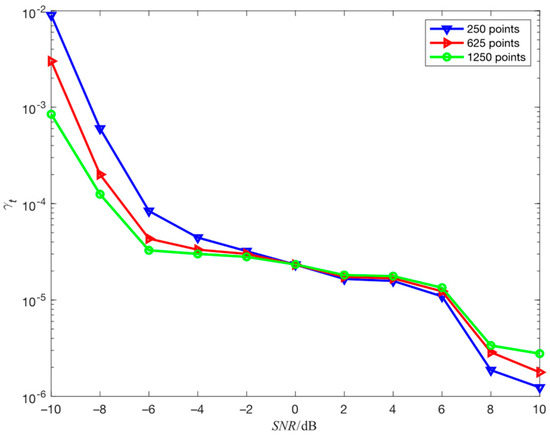 The simulation environment in this section is consistent with simulation 4.2, and the search step size is adjusted from 625 points to 1250 points and 250 points to study the impact of search step size on the estimation performance of the proposed algorithm for hopping time. The results obtained through 100 independent simulation experiments are shown in Figure 8.