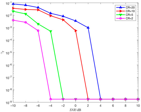 It can be observed from Figure 10 that as the compression ratio increases, the estimation accuracy of center frequency gradually decreases. This is because the higher the compression ratio, the smaller the amount of data obtained by compressed sampling, the less frequency information contained, and the worse the anti-noise performance, provided that the original data amount remains unchanged. Therefore, in a high-SNR environment, increasing the compression ratio appropriately can reduce the computational complexity of parameter estimation while maintaining high estimation accuracy, and in a low-SNR environment, decreasing the compression ratio appropriately can maintain high parameter estimation accuracy.