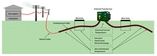 Some works in the literature proposed different types of monitoring systems for underground distribution power systems. In [7], the condition monitoring and diagnostic techniques were revised for underground power cables. In [8], the development and improvement of an intelligent cable monitoring system for the underground distribution power system were proposed using DTS (distributed temperature sensing) technology and OFCPC (optical fiber composite power cables) as the underground distribution lines in the field. In [9], new developments in sensors, IED (intelligent electronic devices), and communication technologies were proposed as attractive alternatives for monitoring the underground distribution network in general and in cable chambers/manholes in particular. In [10], the second generation of an underground sensing and monitoring system was introduced and discussed, and the results and the conclusions of the tests performed by IREQ (Hydro-Quebec, Varennes, QC, Canada) were presented. In [11], a distributed sensor network was proposed, based on several nodes deployed over underground distribution lines useful in urban environments. In [12], a monitoring system was proposed, capable of detecting and classifying the health conditions of MV (Medium-voltage) underground cables.