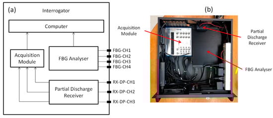Figure 2a shows the block diagram of the interrogator of the monitoring system. As previously mentioned, the monitoring system is based on FBG and PD-LD technologies. In this way, the interrogator is composed of two different approaches. For FBG sensors, we used a commercial module (Hyperion si155 supplied by LunaInc, Roanoke, VA, USA) based on tunable laser technology. This module has four channels, a sweep rate of 1 kHz, and works in the spectral range from 1500 to 1600 nm. The PD-LD module is composed of a 155 MHz optical receiver followed by an RF detector based on an AD8310 integrated circuit and a DAQ board (DAQ-USB-6361 supplied by National Instruments, Austin, TX, USA). Both modules send the data to the main computer, where the data are analyzed and recorded by a self-developed LabVIEW application. Figure 2b shows the modules of the interrogator.