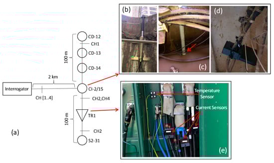 Figure 4a shows the single-line diagram of the monitoring system installed at the downtown underground network and the images of the sensors installed in the distribution network. The interrogator was installed in an electrical substation about 2 km from the sensor installation site. The link that connects the interrogator to the sensors network uses aerial optical cables from the electric utility company. One hundred temperature sensors were installed, divided into two FBG array sensors of 100 m each, monitoring 200 m of underground distribution network. An FBG array is responsible for monitoring the path between CI-2/15 and CD-12, passing through CD-14 and CD-13. The other FBG array monitors the path from CI-2/15 to the TR1 transformer. In addition to the duct temperature sensors, liquid level, intrusion, and partial discharge sensors were also installed on CI-2/15 and current sensors on the TR1 pedestal transformer.