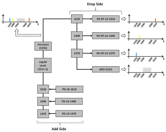 Due to the limitation of the number of optical fibers and considering the spectral window of the FBG interrogator (1500–1600 nm) in this installation, it was necessary to use additional optical components in the optical network. Add-drops were used to allow the partial discharge sensors (operating in 1470 nm, 1490 nm, and 1610 nm) to share the same optical fiber as the intrusion and liquid level sensors (channel 3 of Table 1). In other words, add-drops were used for the multiplexing of the PD optical signals. Figure 5 shows the channel 3 optical configuration.
