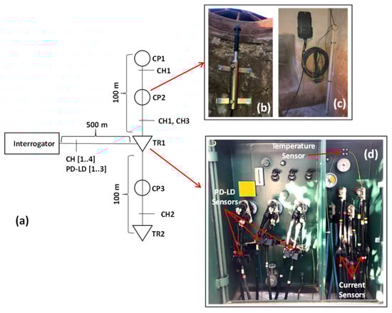 Condominium underground network monitoring, (a) single-line diagram, (b) intrusion sensor, (c) liquid level sensor, (d) PD-LD sensor, temperature, and current sensors.