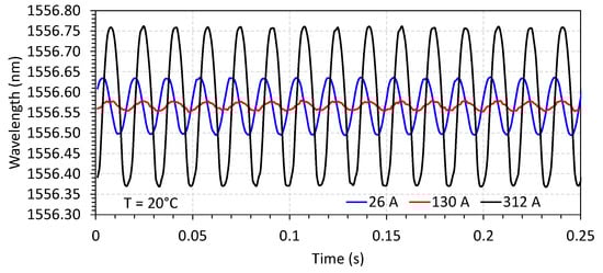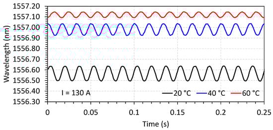 The characterization of the FBG current sensor follows the procedure previously reported in [28]. In this configuration of the sensor, however, the applied bias by a permanent magnet enables the recovery of the waveform without frequency doubling, as can be seen in Figure 7 and Figure 8. Three optical sensors named S1, S2, and S3 were fabricated and characterized to be applied in each phase of the conductor. Figure 7 shows the response of the current sensor S1 in terms of wavelength for a fixed temperature of 20 °C and varying currents (values of 26, 130, and 312 A, in the plot). In Figure 8, the current was fixed (illustrated for 130 A), and the temperature was varied to 20, 40, and 60 °C.