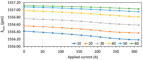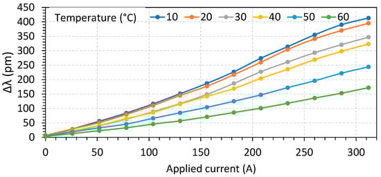 The characterization was performed by recovering the wavelength waveforms and obtaining the Δλ and λmin for temperatures varying from 10 °C to 60 °C, in steps of 10 °C, and varying the current from 0 to 312 A in steps of 26 A. The results for sensor S1 are shown in Figure 9 for Δλ and in Figure 10 for λmin.