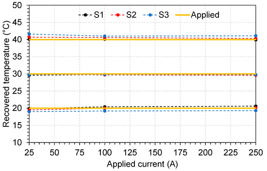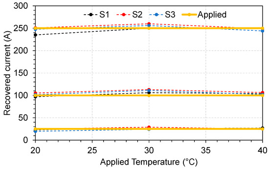 All three sensors S1, S2, and S3 were tested by applying different currents and temperatures using the inverse procedure described in [28]. The currents were set to 25, 100, and 250 A and temperatures to 20, 30, and 40 °C. After applying the mentioned currents and temperatures, the values of Δλ and λmin were used to calculate the current and temperature. In Figure 11, we show the recovered current values for different applied temperatures. All three sensors responded properly in the tested range and slight values of currents were recovered. We observed that one of the causes of this variation is the positioning of the cable inside the sensor, as there is a gap in the magnetic core. The sensor design was made for a large cable compared with the one used in the laboratory.