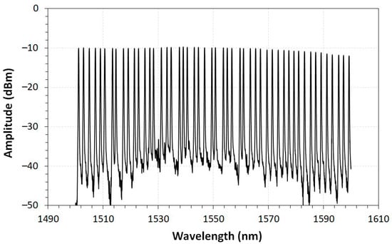 The characterization of the commercial FBG array was obtained by using an FBG interrogator. The FBG array spectrum with 50 peak wavelengths is shown in Figure 13. As can be seen, the 50 FBGs inscribed in the FBG fiber array are almost equally spaced by 2 nm, starting from 1500.5 nm to 1598.5 nm. The spectrum is well balanced with an almost flat response with a maximum deviation of 2.7 dB in the entire range.