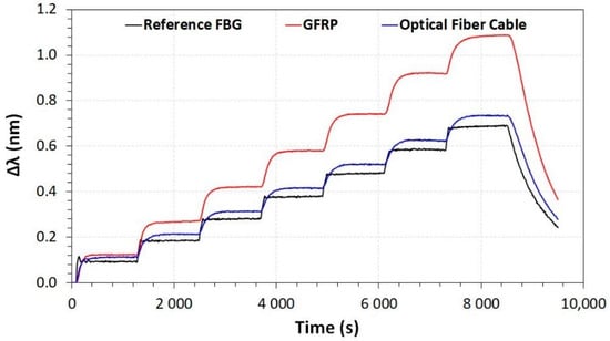 This fact can be better understood by referencing Figure 15. In this figure, the wavelength shifting is displayed as a function of applied temperature after stabilization time. As can be seen, the reference and optical fiber cable have almost the same behavior, while the GFRP has a higher angular coefficient (sensitivity). The sensitives are 0.0098, 0.010, and 0.015 nm/°C for the reference FBG, optical fiber cable, and GFRP FBG array cable, respectively.
