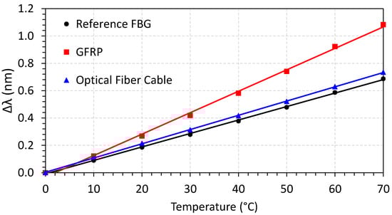 The characterization proceeded with the measurements of the wavelength shifting with the applied temperature inside a climatic chamber. The temperature was varied from 0 to 70 °C. Inside the climatic chamber, two FBG array cables were tested, one with GFRP and the other inside a conventional optical fiber cable. A reference FBG was also used as a comparison. Figure 14 shows the results of the wavelength shift as a function of elapsed time for these different FBG array cables and reference FBG. As can be seen, the reference FBG and the FBG array in a conventional optical fiber cable have close wavelength shift results, with the FBG array having a slower heating process. On the other hand, the FBG array with GFRP resulted in higher wavelength shifting—in other words, the GFRP FBG array has greater temperature sensitivity.