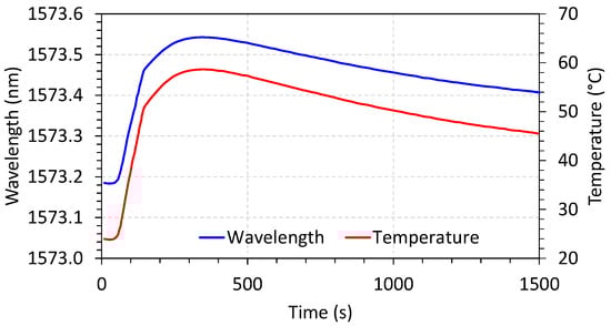 The punctual temperature sensor was characterized using a thermal cycle of heating and natural cooling. The wavelength shifting was compared with a reference temperature sensor (thermocouple), and the result is shown in Figure 16.