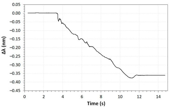Another characterized sensor was the liquid level sensor, in which the wavelength shifts as a function of time when increasing the water level from 0 to 1.5 m, as is shown in Figure 17. The wavelength shifting is negative and reaches −0.36 nm for a water column level of 1.5 m.