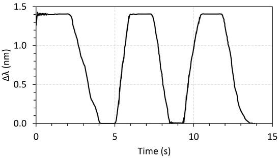 Finally, the intrusion sensor was tested by performing three displacement compressions of 50 mm, resulting in a wavelength shift of 1.4 nm, as shown in Figure 18. This wavelength shifting is more than sufficient to detect a state of intrusion during an opening of the manhole. This sensor will work through threshold detection. In other words, if the initial wavelength shifts more than a predefined value, an intrusion is reported.