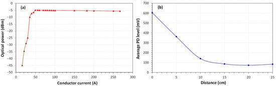 The homemade PD-LD sensor was characterized in terms of optical power as a function of conductor current and in terms of average PD level as a function of the distance of the PD source. As shown in Figure 19a, the sensor will be operational if the conductor current is above 50 A, resulting in a constant optical power emission of −5 dBm. The sensor operates up to 50 cm from the PD source (in the air, with no obstacles), as shown in Figure 19b. Therefore, the distance from the suspicious PD source to the sensor must be taken into account where the sensor is placed.