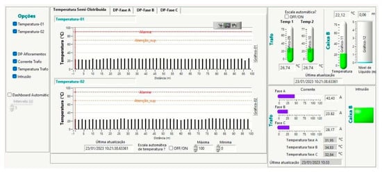 Figure 4b shows the displacement sensor installed below the manhole door, while Figure 3c shows the liquid level sensor installed inside a tube in the manhole wall. Figure 3d is a picture of the PD-LD sensor installed near a medium-voltage connector, and finally, in Figure 3e, it is possible to see the temperature sensor fixed on the pad-mounted transformer wall, as well as the current sensors plugged into the low-voltage conductors of phases A, B, and C.