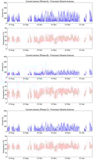 In Figure 29, we compare the current and temperature acquired at the condominium and on Glicerio Avenue. As can be seen, the current in both places is not in phase. This behavior is explained by the difference in load activity at these sites. The higher consumption occurs at night at the condominium when people return from work activities to their homes and use showers and air conditioners. Conversely, Glicerio Avenue is a commerce place where higher consumption occurs during the day. Regarding the temperature, we observe that both installation places mimic the data obtained from a meteorological station in the metropolitan area of the city.