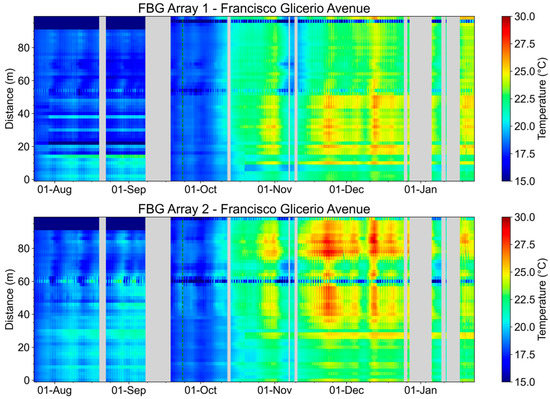 For the medium-voltage cable, according to [29], the maximum temperature in steady state is 90 °C; in case of overload, it is 130 °C and 250 °C in a short circuit for conductors with XLPE insulation. During the measurements, the maximum temperature recorded was 27 °C on Glicerio Avenue and 30 °C at the condominium, and, as previously shown, is directly related to the variation in the ambient temperature. No anomalies were detected during the period. Furthermore, according to [29], a correction must be applied to the value of the maximum current of the conductors according to the increase in temperature in the environment where the conductor is installed. This analysis is applicable through the value of the environmental temperature measured by the FBG array sensors, in such a way that it is possible to know the maximum current that can be applied to the cable, optimizing the network operation. In this way, temperature sensing along the conductive cable can indicate punctual faults in the cable or network elements and is useful for verifying the ampacity of the circuit being monitored. A punctual fault in the cable could affect the conductivity of the conductor material (copper or aluminum) at this point. The conductive change will increase the temperature and can degrade the cable insulation, causing current leakage and even a short circuit between the conductor and armoring of the medium-voltage cable. Monitoring the temperature along the cable can prevent current leakage and even a short circuit, avoiding electrical network unavailability, and allows optimizing the cable ampacity, as the current carrying capacity in the electrical cable is linked to the ambient temperature.