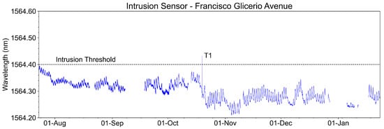 Figure 32 shows the temporal evolution of the intrusion sensor measurements (wavelengths captured from August 2022 to January 2023). We highlighted in the graph the events T1 and T2, where there were two intrusion tests with the opening of the manhole cover, above where the sensor was installed. It is observed that the wavelength exceeded the threshold established for intrusion detection.