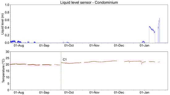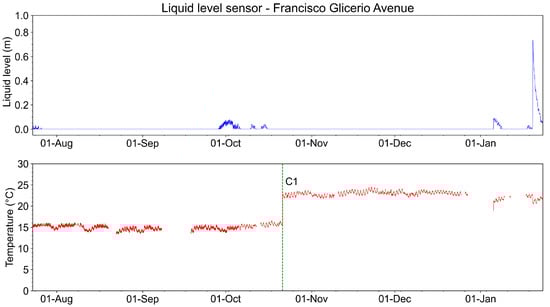 Figure 33 shows the measurements of the liquid level sensor (in meters) and its temperature from August 2022 to January 2023. During almost all this time, the liquid level in the manhole remains under 0.10 m, meaning that the manhole was empty. Regarding the measured temperature, during all this analyzed time, the temperature was close to 20 °C. We highlighted in the graph of Figure 33 a correction for the temperature measurement (C1). The temperature adjustment was made using a calibration instrument. The temperature was measured in the sensor location through a thermocouple. The measured temperature was compared to the system measurement. The difference found was +1.7 °C. Compensation was made by adding +1.7 °C to the system measurement. The liquid level exceeded the 0.10 m level two times during the entire period of monitoring. These events are associated with intense rains in January 2023.
