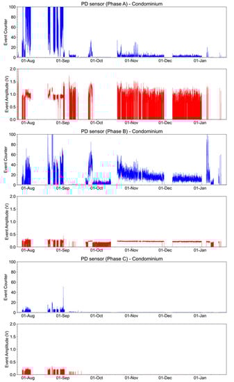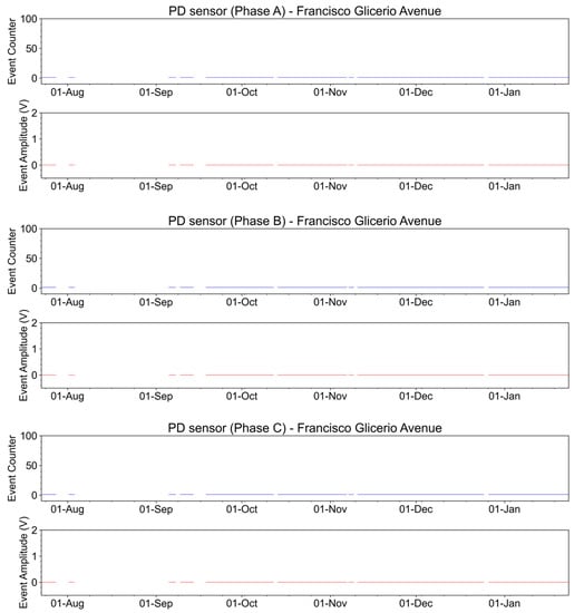 Partial discharge measurements had similar tests as the downtown site. During one of the visits to the condominium, the optical power received by the interrogator was initially measured. In this evaluation, the absence of optical power in all sensors was also verified, indicating that the sensor’s laser was not operating above the threshold. The currents of the conductors where the partial sensors were installed were 1.3 A, 1.4 A, and 2.0 A for phases A, B, and C, respectively. However, the levels of discharge in the medium-voltage connectors used to connect to the transformers were high enough to be detected by the sensors, as shown in Figure 34. The discharges are more intense in phases A and B in terms of events and amplitude.