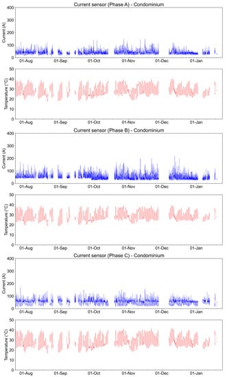 Figure 28 shows the current and temperature measurements in the three secondary phases of the transformer at the condominium installation. The lack of data in the graphs corresponds to moments when the system was offline and data were not recorded. The maximum current occurs for phase B and corresponds to 220 A.