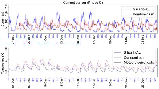 Comparison of data for the condominium and Glicerio Avenue of the recorded current and temperature in the secondary of the transformer (Phase C) from the end of July 2022 to January 2023. Also shown are the meteorological data.